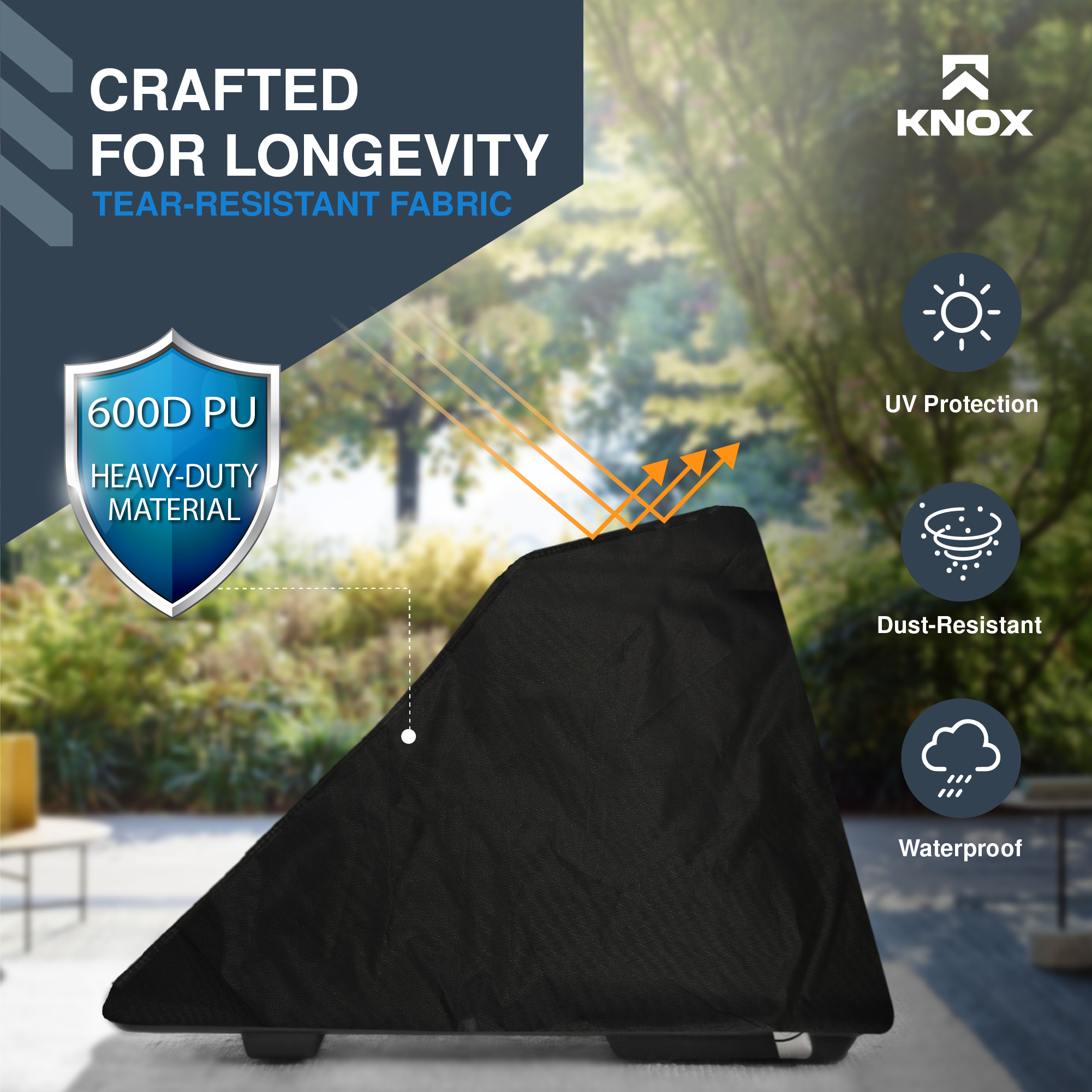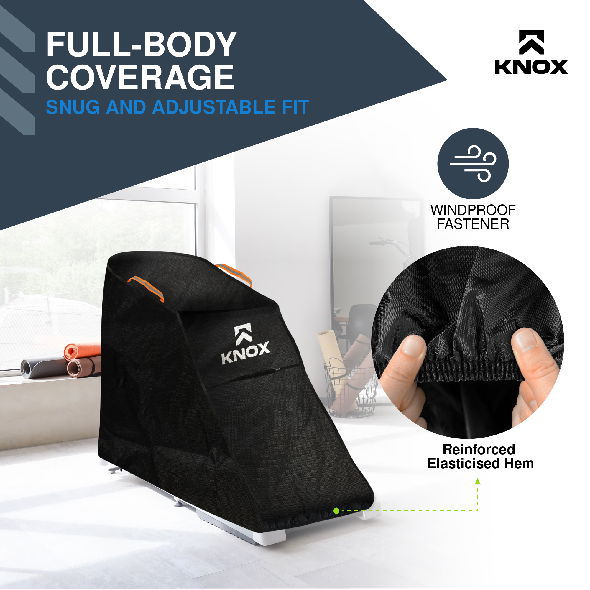 - [FULL BODY COVERAGE] - Protect your outdoor treadmill with our full-coverage cover. The KNOX treadmill dust cover shields against wind, rain, frost, sun, dirt, and debris. It boasts sturdy interior seams that are glued for enhanced durability. A drawstring closure ensures a snug fit, keeping the cover secure even in strong winds. Whether indoors or outdoors, KNOX waterproof covers for outdoor equipment provide reliable protection to maintain your treadmill in top condition.
