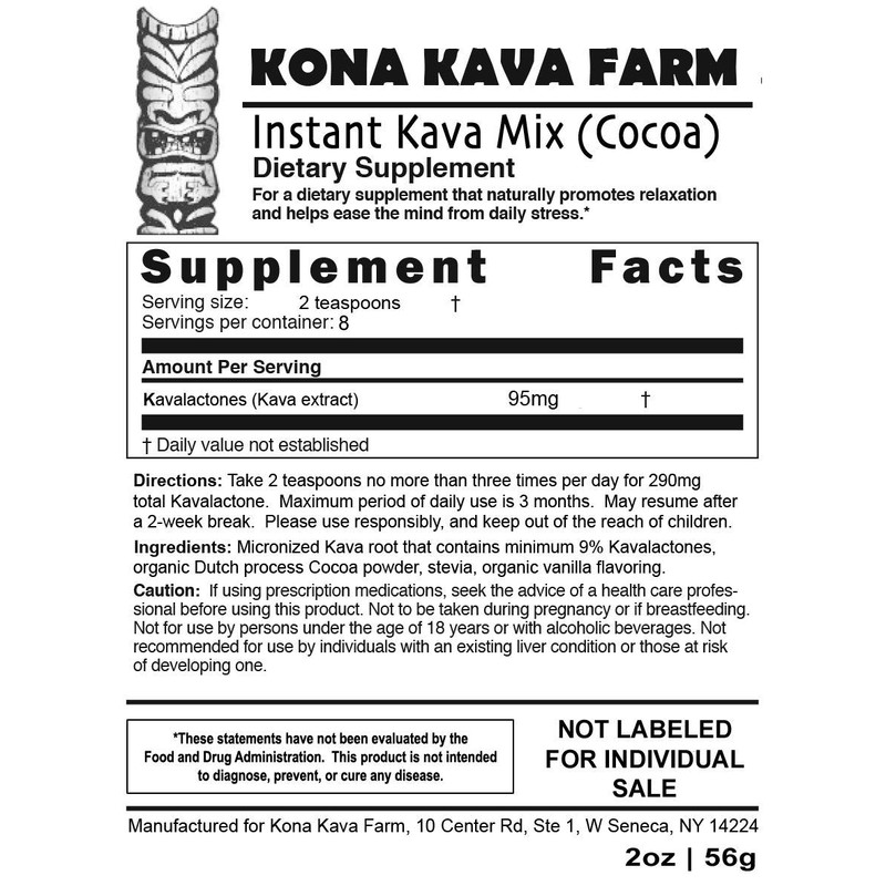 - This Kava Sampler Pack gives you an idea of the many fine Kava Kava products that Kona Kava Farm has to offer. Each Sampler Pack contains: Bag of Powdered Kava Root (4oz) | Reusable Muslin Extraction Bag | Instant kava single (0.75oz) | Pack of Instant Kava Cocoa Powder (2oz) | 30% Kavalactone Capsules (6)