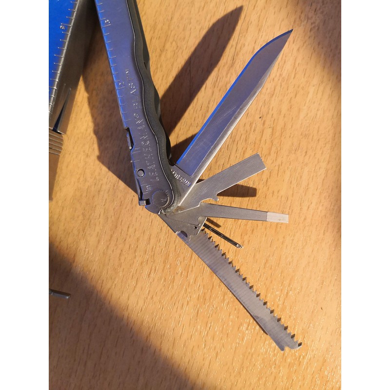* Needlenose pliers * Regular pliers * Wire cutters * Hard-wire cutters * Clip-point knife * Wood/metal file * Saw * Scissors * Large screwdriver * Small screwdriver * Phillips screwdriver * Small bit driver * Ruler (8 inch/19 cm) * Bottle/can opener * Wire stripper * Lanyard attachment * One double-ended bit
