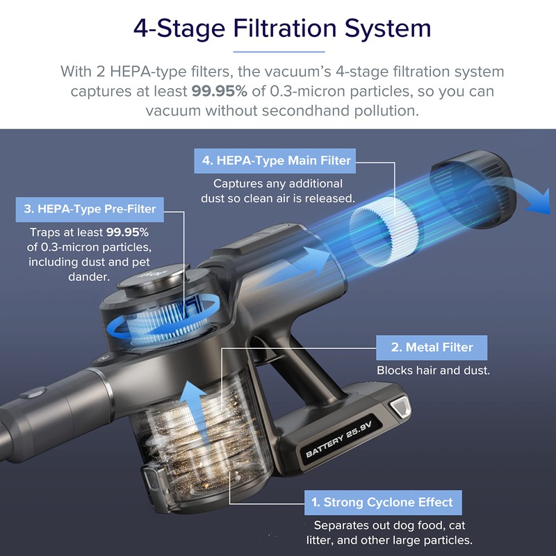 - Prevent Secondhand Pollution: A part of the vacuum's 4-stage filtration system, these 2 HEPA-Type filters capture at least 99.9% of 0.3-micron particles, releasing clean air without secondhand pollution as you vacuum
