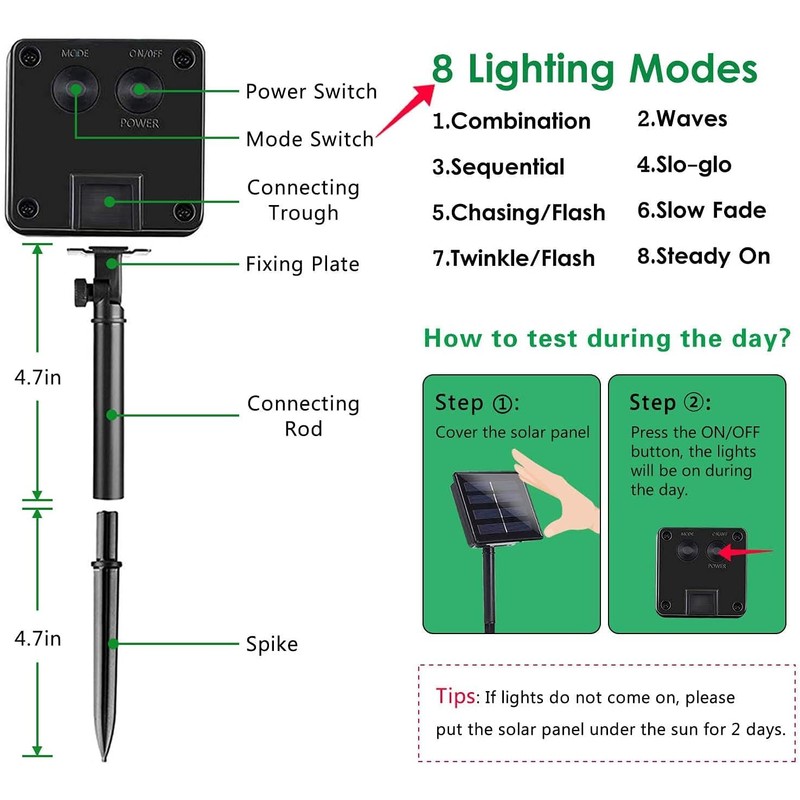 - 8 Lighting Modes & 2 Switches for Customizable Ambiance: Featuring an On/Off button and a mode button, these solar patio lights offer 8 lighting modes: In waves, Combination, Sequential, Slo-glo, Chasing/Flash, Slow Fade, Twinkle/Flash, and Steady On. Choose the perfect mode to suit your diverse lighting needs and create the desired atmosphere.