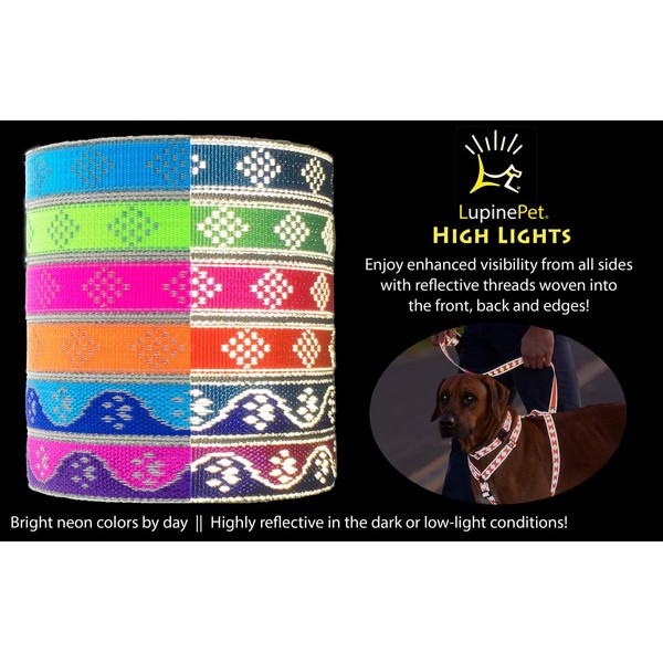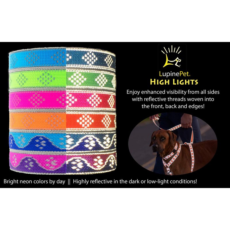 Lupine High Lights are available in 6 bright colors, made from nylon with reflective threads woven into the front, back and edges for maximum visibility. The reflective threads bounce light back to an observer so that these products may be seen in low-light or dark conditions when light shines on them. Made with strong bar-tack stitching, welded steel hardware, and ends which are turned under and stitched to protect fur and skin. Matching flat collars, harnesses and leashes are available.