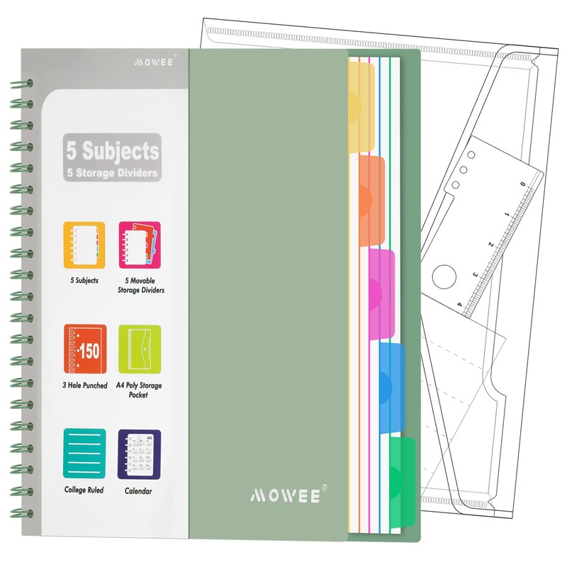MOWEE 5 Subject Notebook - Spiral Notebook, College Ruled Notebook With Dividers Pocket, Tabs, 11" Ruler, 300 Pages, for Writing Journal, Home & Office, School Supplies, 8.5x11''Forest Green 150Sheets