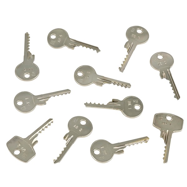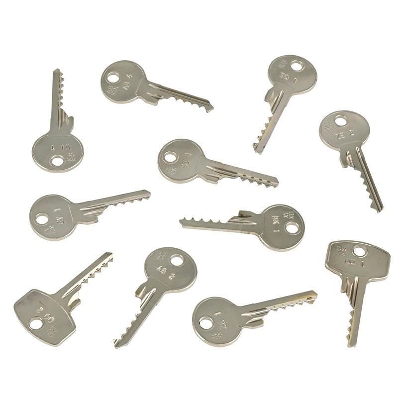 This set includes one bump key each: AB 2 (the most important key for the left left ABUS series, C83, C73, C42 etc. 5-pin), AB 4 (right-hand driven old locksmith ABUS profile 5-pin), BK 1 (BKS series 88, 5-pin), CE 1 (type 810 round key head 5-pin), DO 1 (DO) M-RS 55 pcs t), DO 2 (DOM-RN 5-pin), EV 1 (EVVA A-profile, 5-pin), TO 1 (TOK/TRELOCK left, 5-pin), WI 1 (WILKA 6-pin), ZE 1 (ZEISS-IKON left guided 5-pin, 4 mm pin spacing), ZE 2 (ZEISS-IKON right guided 5-pin, 4 mm pin spacing). .