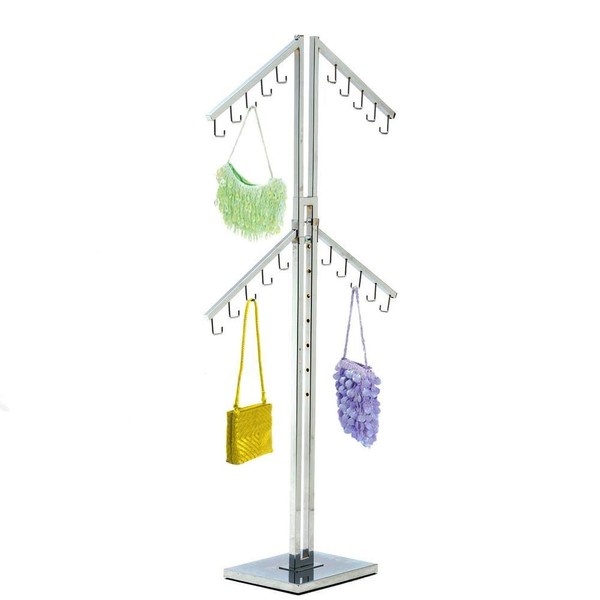 Only Hangers Commercial grade Handback Rack is a sales floor essential and a wonderful addition to any retail environment. Easily adjust the J hook arms into different positions to highlight your handbags and fashion accessories on multiple levels. This handbag rack features push button upper arms that make it easy to adjust from 48" to 72". Additional lower clamp-on adjustable height J-Hook arms will add extra tiers of display capability. This handbag display rack has four attractive waterfall style arms with five hooks on each. The heavy 15" x 12" square weighted base is very stable. This handbag display rack has a chrome finish that looks great on any showroom floor. These purse racks are also ideal for cross merchandising purses scarves jewelry and other accessories.