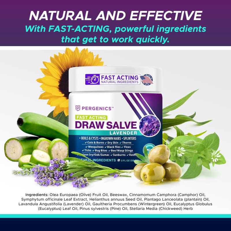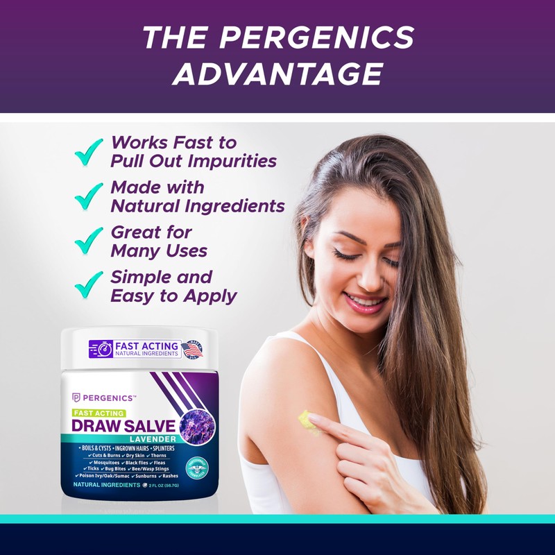 As one of the most potent and Fast acting draw salves on the market. This powerful salve is specially formulated for irritations, boils, readiness, ingrown Hair, Boil & Cyst, Splinter Remover, Bug and Spider Bites, bee Sting, Mosquito bite Itch, Poison IvyWhat makes Pergenics All-Natural Draw Salve special is its unique and natural ingredients. This means that can be used with confidence, without the fear of experiencing any form of allergies. All-Natural Draw Salve works quickly acting for sores, splinters, boils, and more.Reach for All-Natural Draw Salve for quick, and soothing acting for burns, boils, cut, scrapes, and more.For External Use OnlyParaben Free - GMO Free - Fresh Honey Lavender ScentMade in USA