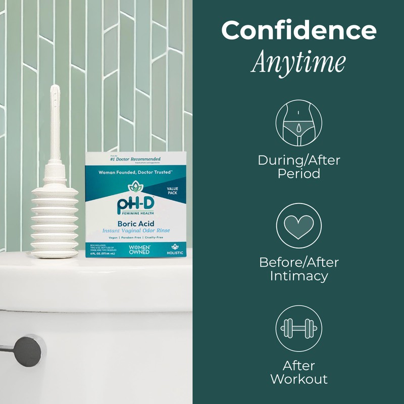 • VAGINAL ODOR: pH-D Instant Vaginal Odor Rinse is made with boric acid and purified water and can be used for feminine odor. It can be used with pH-D Boric Acid Vaginal Suppositories and pH-D Body Fresh Spray as a complete system.