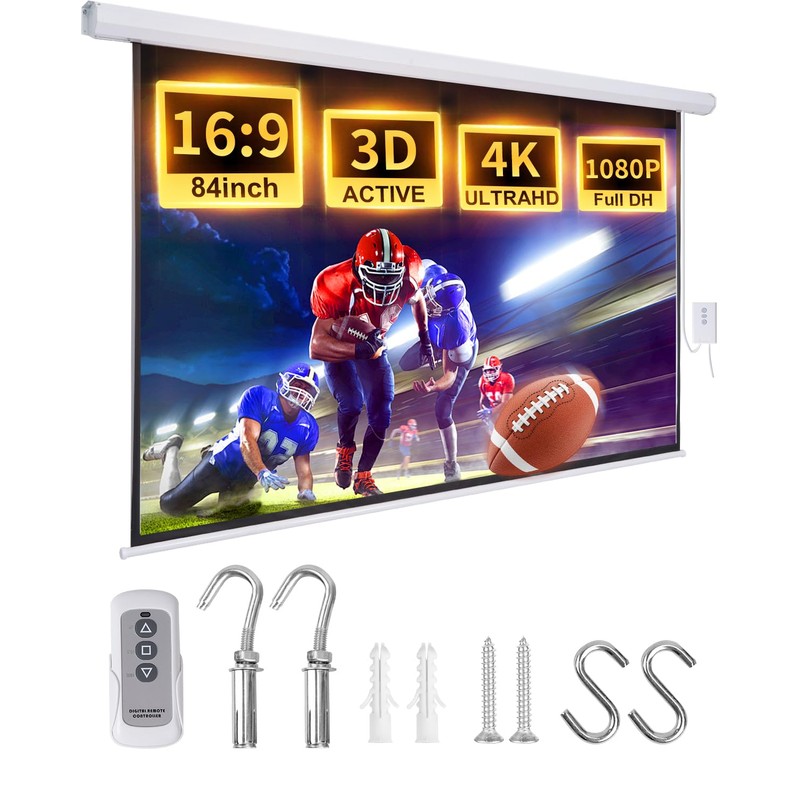 Projector Screen Motorized Pull Down 84 Inch 16:9 Electric Projector Screen with Remote, Automatic Projector Screens Wall Ceiling Mount Small White Movie Screens for Projectors Outdoor Indoor