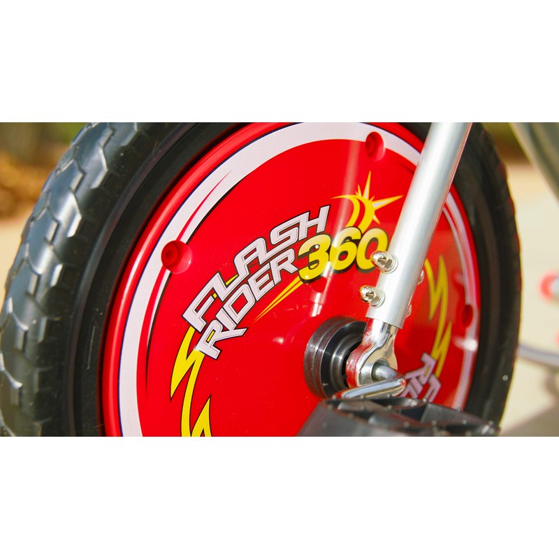 - Welded steel frame and fork, dual inclined casters for drifting and spinning action, and high-impact front wheel with flat-free tire