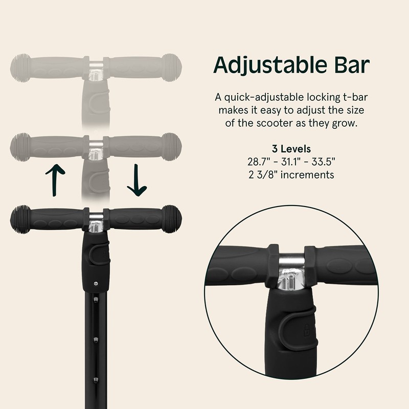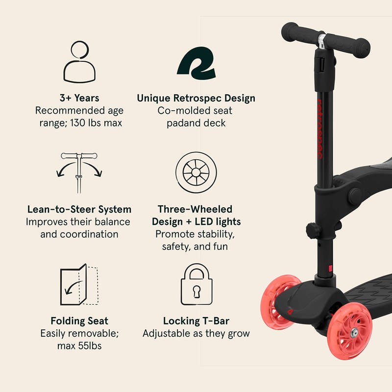 - ADJUSTABLE SEAT & BAR: The Retrospec exclusive co-molded adjustable folding seat adjusts to 12, 13.5, and 15”(max 55lbs). Fold it up or easily remove it with the push of a button. The quick-adjustable locking t-bar adjusts to 26.5, 29, 31.5” making this scooter fully customizable as they grow!