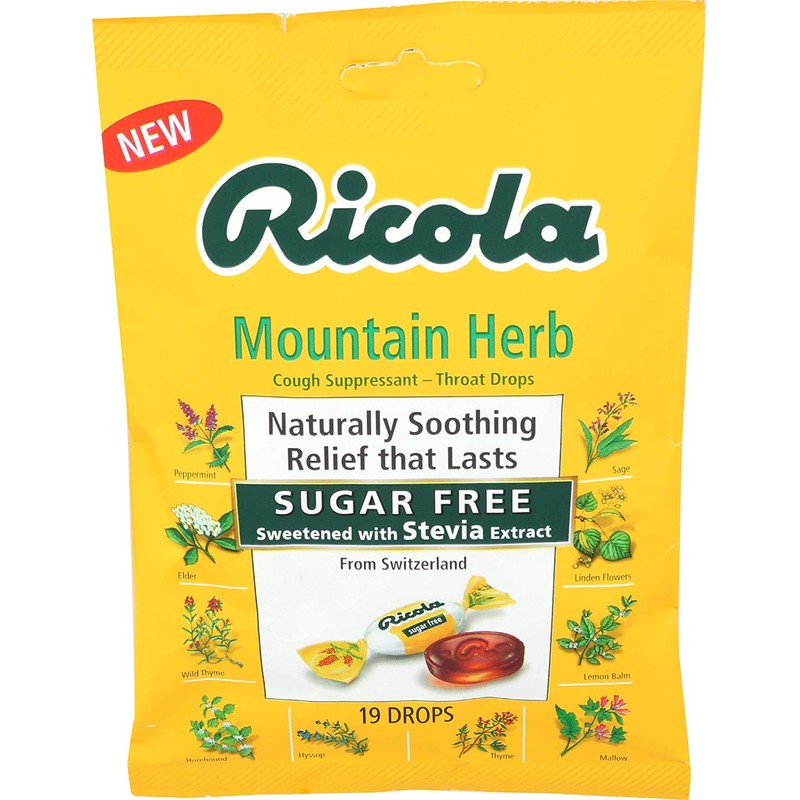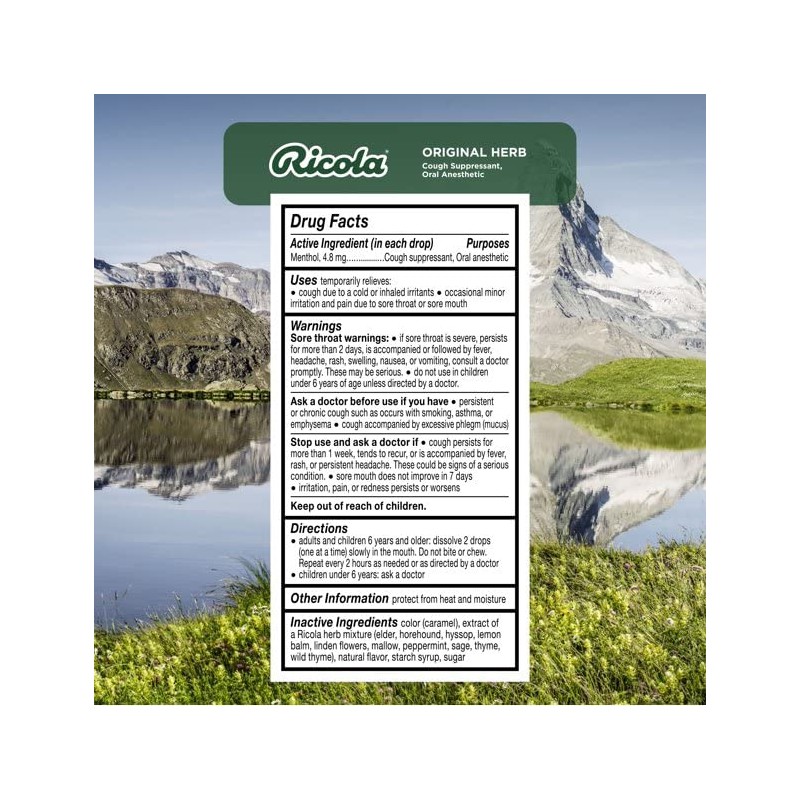 - RICOLA SUGAR-FREE ORIGINAL SWISS HERB THROAT DROPS: For nearly a century, Ricola has been helping throats feel better naturally. Using only high-quality herbs grown high in the Swiss mountains to make our world famous herb cough drop. Along with its pleasing herbal taste and unique square shape, it provides you soothing relief from coughs due to colds or flus, and can also help with itchy throats from allergies. Active Ingredient (in each drop): Menthol, 4.8 mg
