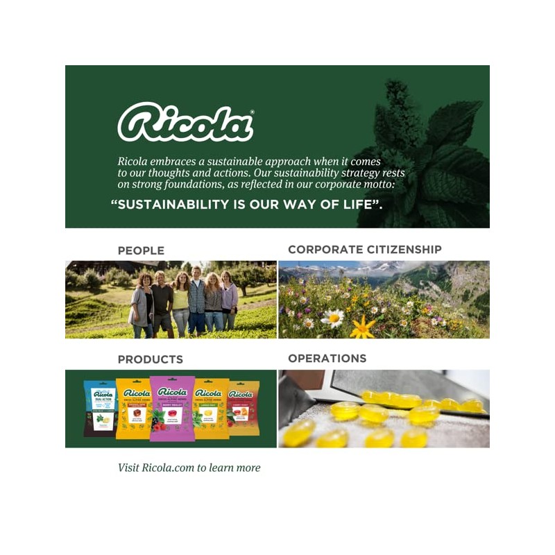 - QUALITY AND SUSTAINABILITY: Ricola's top priority is to ensure our raw materials are the highest quality and to maintain the exceptional standards when producing our various herb specialties. This is why our herbs are cultivated using natural methods in the Swiss mountains. Ricola embraces a sustainable approach when it comes to our thoughts and actions; our sustainability strategy rests on strong foundations as reflected in our corporate motto, 'Sustainability is our way of life'