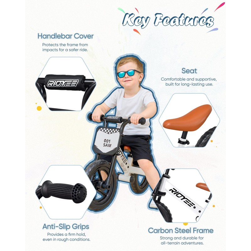 - Built for Versatility and Stability: RIDYEE kids balance bike 2 year old builts with rust-resistant carbon steel, anti-slip handlebars, and versatile tires for various terrains like concrete, wood, soil, and grass.