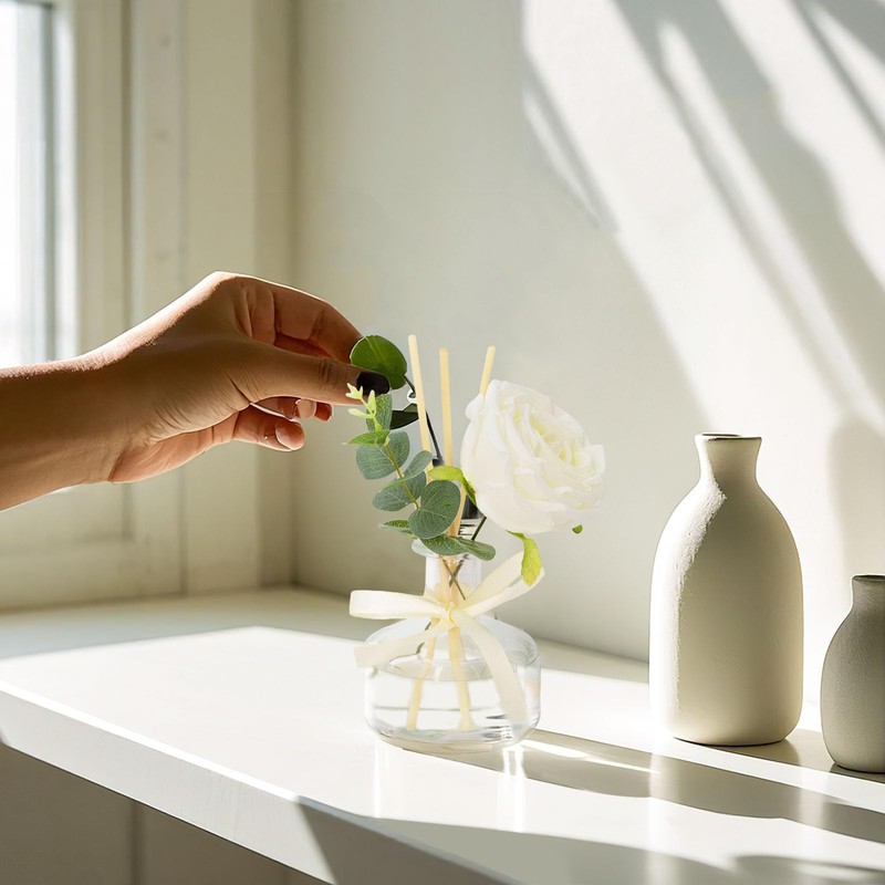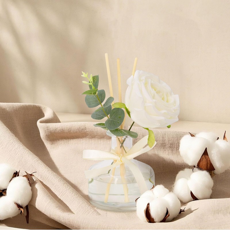 - Complete Reed Diffuser Set Includes: (1) 7.1oz (210ml) natural essential oil blend (210ml); (2) simple but unique design glass bottle; (3) an artificial rose; (4) a simulated eucalyptus; (5) 7 essential oil reed diffuser sticks; (6) an adjustable satin ribbon. Everything needed for stylish home fragrance decor.