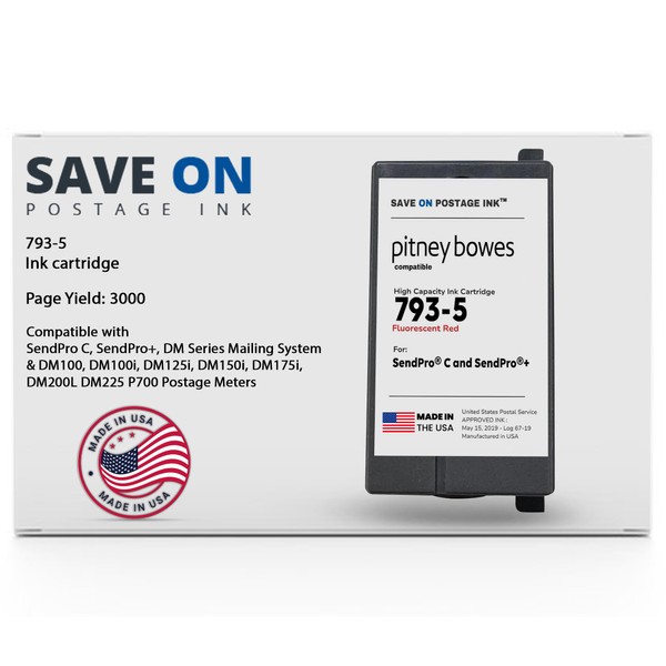 • PITNEY BOWES COMPATIBLE RED INK CARTRIDGE: Use Save on Postage Ink for all your SendPro C, and sendpro+ and DM Series Mailing Systems today! Our USPS-certified red 793-5 postage ink cartridge has SendPro 793-5 compatibility. You can also buy our products assured, knowing we offer full warranty protection and we will pay for machine damage, if any occurs.