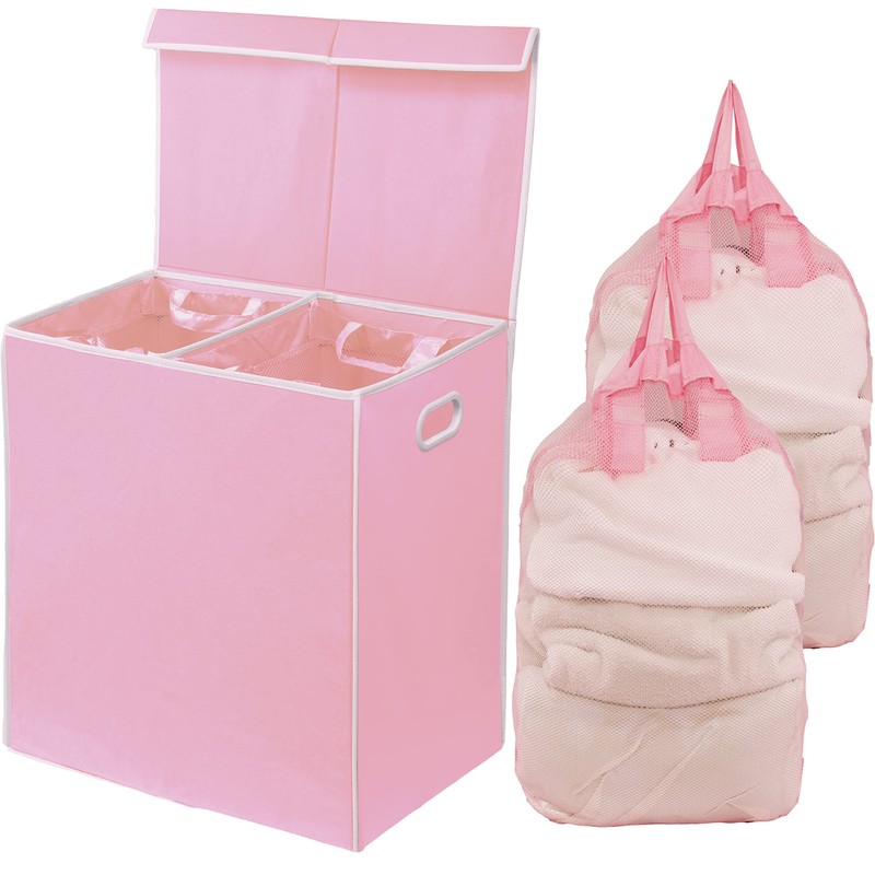 SimpleHouseware Double Laundry Hamper with Lid and Removable Laundry Bags, Pink