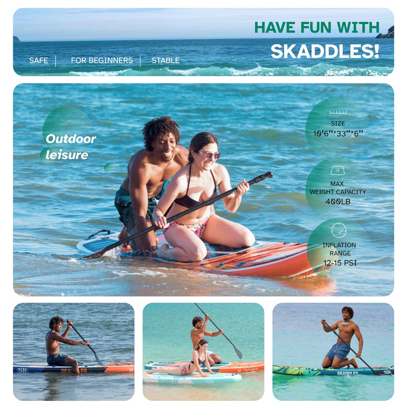 - 【High-Quality Inflatable Paddle Board】 The SKADDLES inflatable paddle board is made of PVC material, offering exceptional durability and puncture resistance. It is suitable for various water activities, whether on calm lakes or rough ocean waves, providing outstanding stability and comfort.