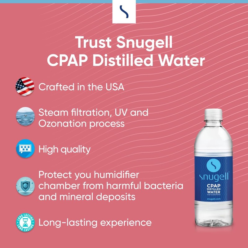 - Made in USA: Trust in the quality of Snugell CPAP Distilled Water, proudly crafted in the USA. Our meticulous steam filtration, UV, and Ozonation processes guarantee a pure and high-quality product. Opt for the assurance of a premium, domestically produced distilled water for your CPAP machine and beyond.
