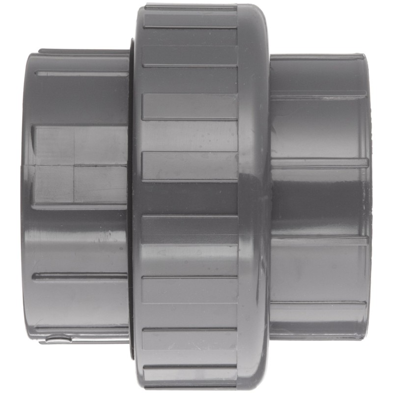 This Spears schedule 80 PVC union fitting has female NPT threads on both ends, and is suitable for connecting two pipes. The National Pipe Taper (NPT) threads create a tighter seal than straight threads. The fitting has three pieces and includes a threaded connection that can be screwed or unscrewed to connect or disconnect pipes more easily than with couplings. It is made of gray PVC (polyvinyl chloride) for chemical and corrosion resistance, high strength, and less weight than fittings made from metal, and has an EPDM (ethylene propylene diene monomer) seal for resistance to oil, water, and some solvents. It is compatible with schedule 80 (thick wall) PVC pipes and fittings, and is suitable for chemical processing, industrial plating, chilled water distribution, deionized water lines, and chemical drainage and wastewater treatment systems. PVC can be connected to other materials such as steel, copper, or cast iron using transition fittings. The fitting has a maximum operating temperature of 140 degrees F, and a maximum operating pressure of 235 pounds per square inch (psi) at 73 degrees F. It meets ASTM International D1784 and D2467 standards for quality assurance, and is certified by National Sanitation Foundation International (NSF) for potable water service. This schedule 80 PVC union fitting is suitable for connecting pipes for conveying drinking water, waste water, chemicals, and other liquids in a range of industries.