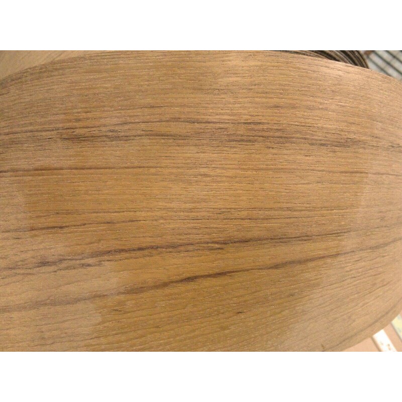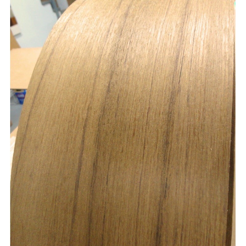 Teak wood veneer edgebanding 2'' inches x 10' feet with preglued hot melt adhesive. Product has a thin layer of fleece in between the wood and the adhesive that holds the joints together. Activate adhesive with household iron or hair dryer. Apply pressure with something flat like the veneer scraper shown (sold separately) while the product cools. Trim excess overhang with utility knife or edgeband trimmer (shown - sold separately) or sand of excess. It is best to buy edgebanding slightly over-sized. Photos are kept current but product may vary in color and grain and may be wide or narrow. Teak is a wood that varies greatly in color and grain and usually has dark streaks, but not always. Some photos may show other sizes, other products, wet or finished veneer. Product is unfinished.