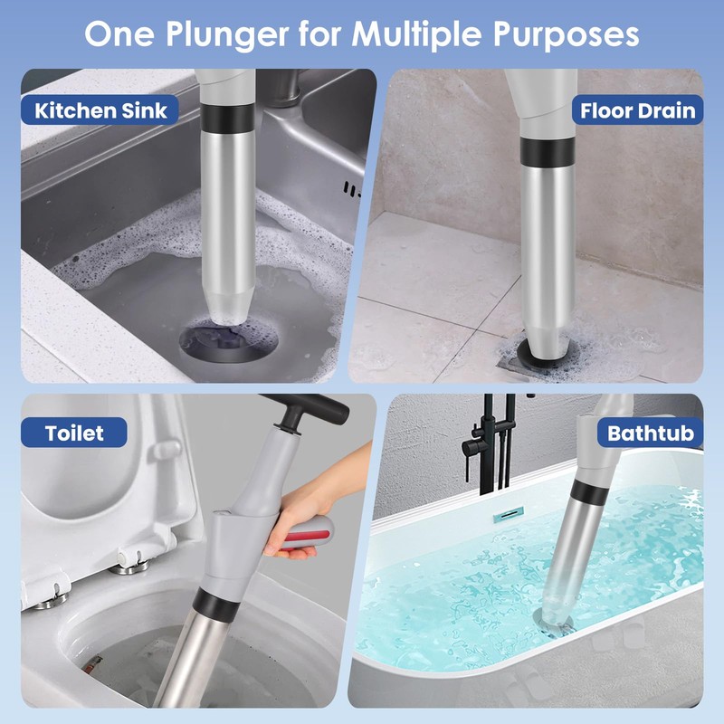 - 【Safe & Durable】Sink unblocker and plunger toilet unblocker is made of stainless steel air reservoir with enlarged barrel and explosion-proof interior, which can withstand high strength and pressure for long-lasting durability; head of toilet unclogger and toilet unclogging tool is designed with a sealed balloon, which is inflated to seal pipes of different sizes and hole diameters, not easy to splash water, safe and reliable