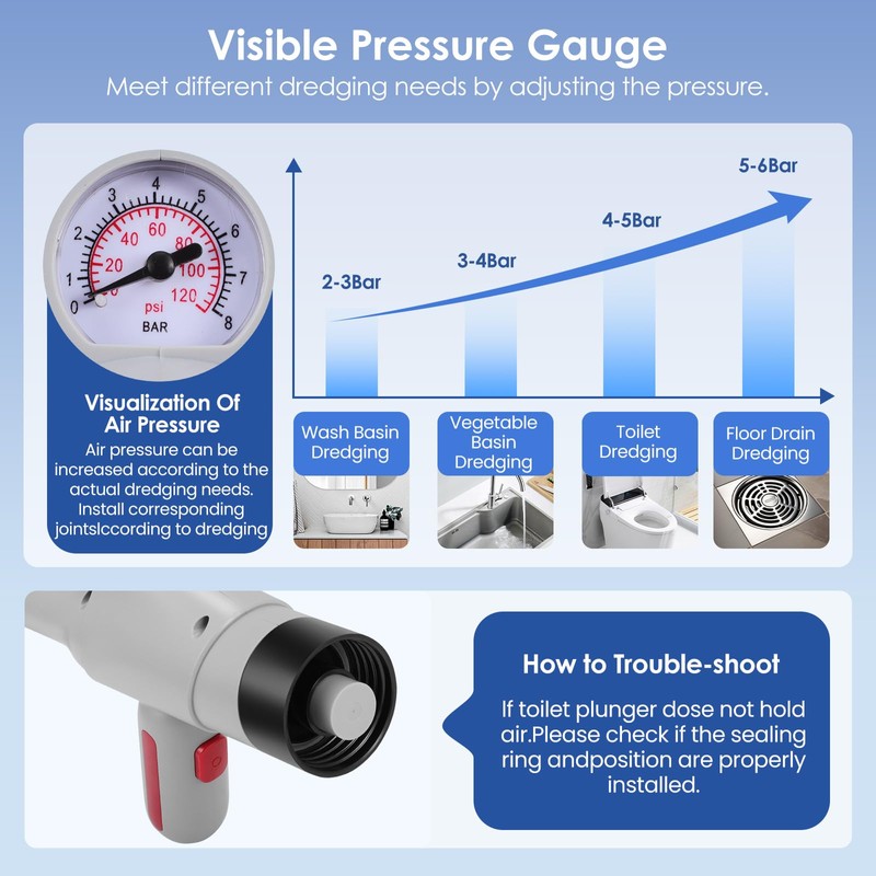 - 【Real-Time Pressure Display For Precise Control】Take control of your plumbing with the built-in pressure gauge, with a maximum pressure of 8 bar (8 PSI); Blocked toilet unblocker and toilet plunger unblocker heavy duty uk are perfect for those DIY moments when you need to fix a clogged sink before dinner or clear a toilet before guests arrive; Adjust the pressure based on the task at hand for the best results every time