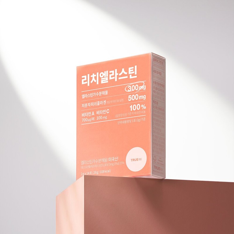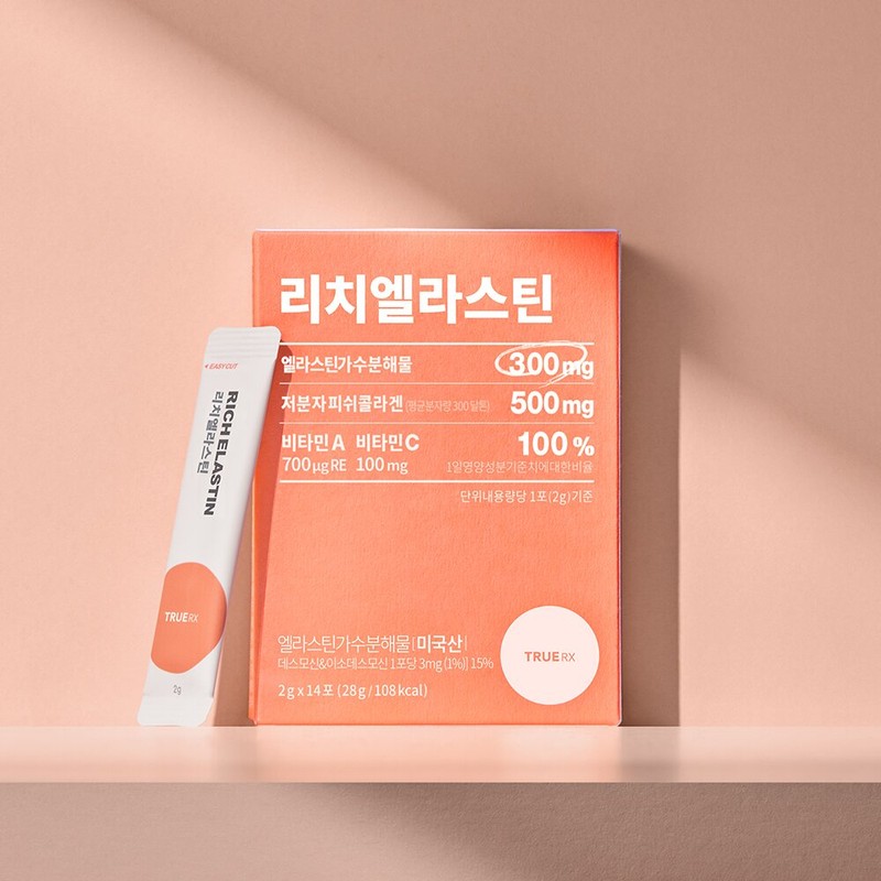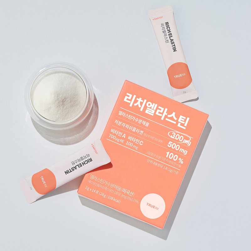 Contains the maximum daily content of 300g elastin hydrolysate. Rich Elastin uses Arctic Ocean Elastin containing 1% Desmosine and Isodesmosine. Desmosine and Isodesmosine is a unique amino acid found only in Elastin, and it cross-links the Elastin and Collagen. This product insists on using Elastin derived from northeast arctic cod. Be sure to check the elastin content, raw ingredients, country of origin and Desmosine and Isodesmosine content. The main ingredient, 300mg of Elastin Hydrolysate is included. This product contains sub-ingredients such as 500mg of low-molecular fish collagen, milk ceramide, hyaluronic acid, and vitamins A and C. Hyaluronic acid fills the gaps in the skin dermis, and Elastin helps to link collagen, which firmly builds the dermis layer. This product upgraded to 300Da of low-molecular fish collagen is used for better absorption. Rich Elastin does not use synthetic fragrances, colorants, or additives for taste, texture, or convenience in the production process. Free of 14 ingredients such as synthetic fragrances, colorants, silicon dioxide, etc.