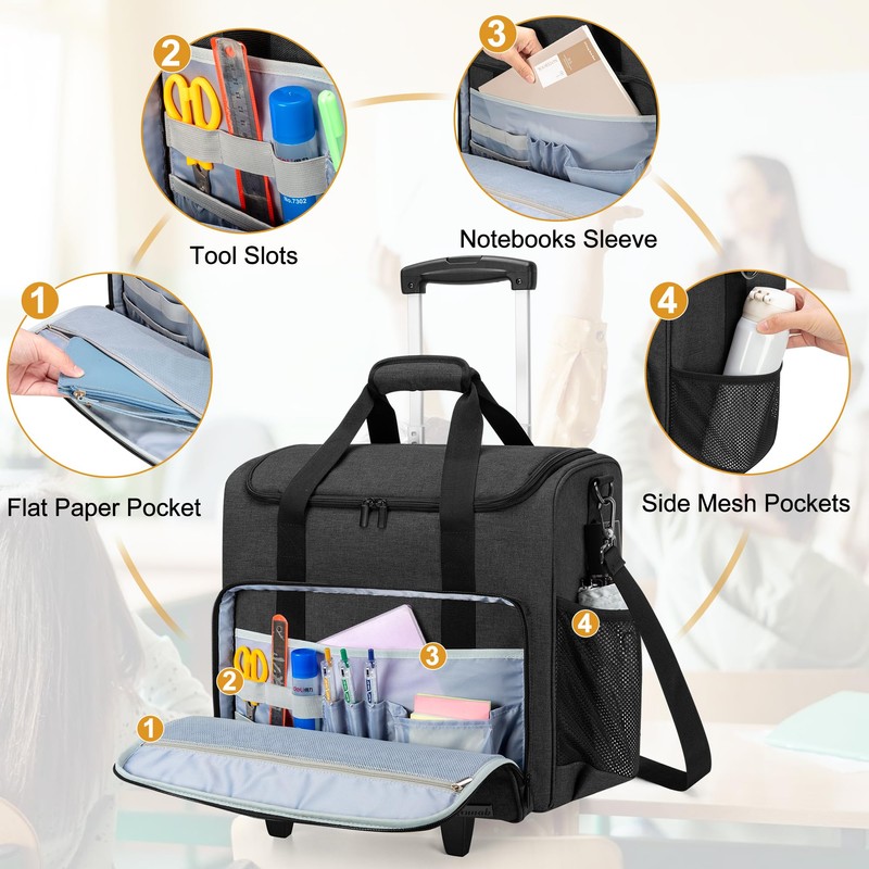 - WELL DESIGNED: This rolling teacher bag is made of good quality materials, is water-resistant, with a two-way zipper design, considering every aspect of your use experience.
