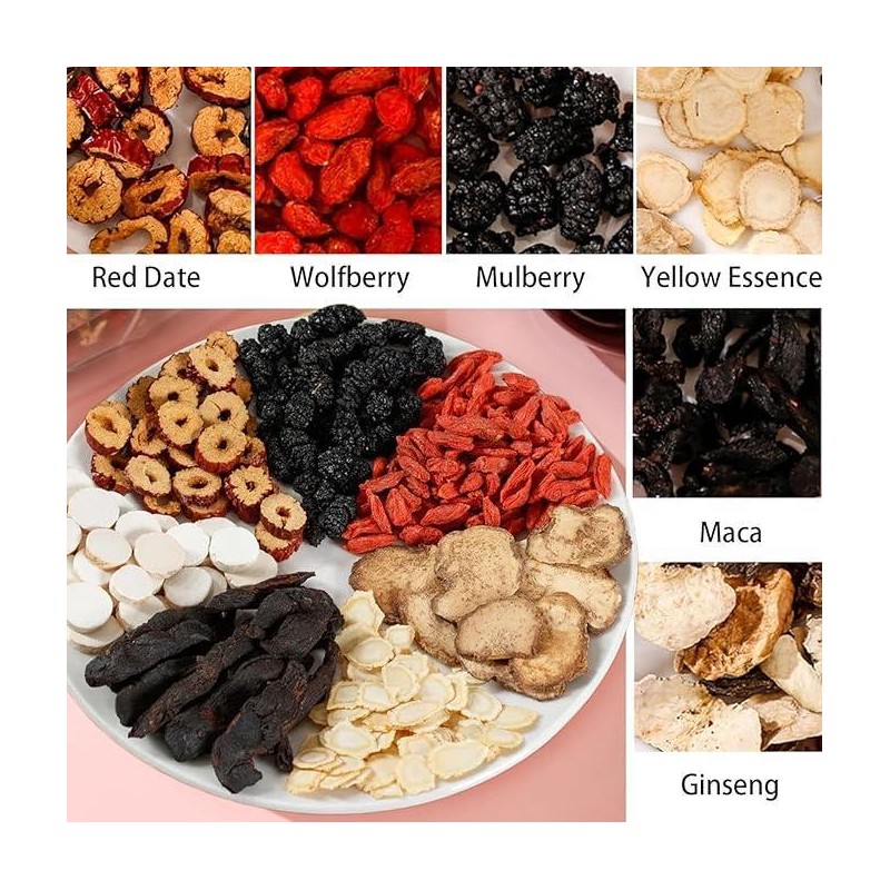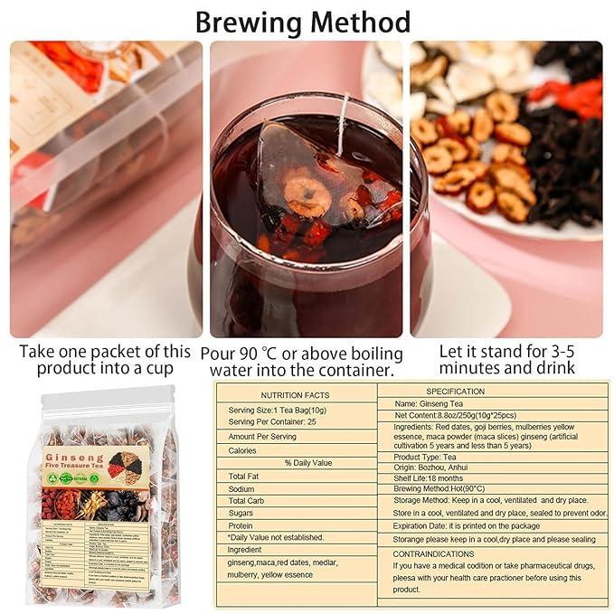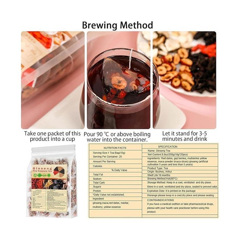 - Taste & Texture: Babao tea -Ginseng eight Treasures Tea Kidney Tea has a strong taste and a sweet taste in the mouth. If you taste it carefully, you will have the aroma of Jujube, Mulberries and Ginseng. The color of Babao tea soup is deep and full of essence ingredients. Ginseng Tea is of good quality. Kidney tea organic cares more about men and understands men better. When you are tired, have a cup of Eight Treasures Tea.