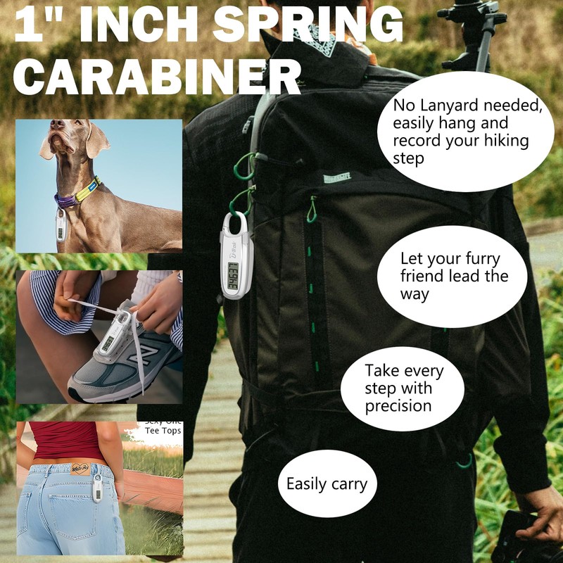 - 【Convenient, Practical and Easy to Carry】U-Trak step tracker equipped with removable clip and a spring carabiner, eliminating the need for a lanyard. You can clip the step tracker to your waist, or put this step tracker into your pocket, or hang this step tracker on your hiking backpack, or even attach it to your dog's collar. This versatile design allows for multiple wearing options, making it convenient for various activities and lifestyles.