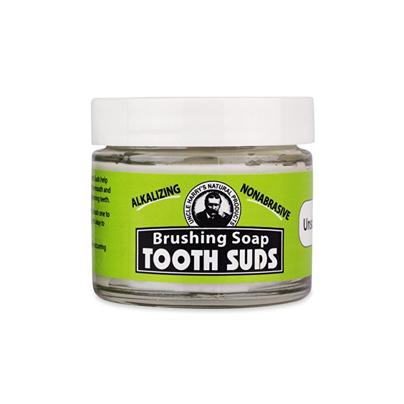 Uncle Harry’s Natural Products Alkalizing Nonabrasive Brushing Soap Tooth Suds, Peppermint, Remineralizes Tooth Enamel and Promotes Alkaline pH, Fluoride Free and Vegan, 2 Ounce Glass Jar
