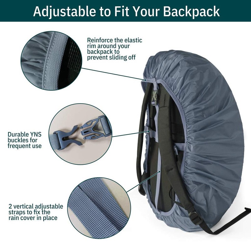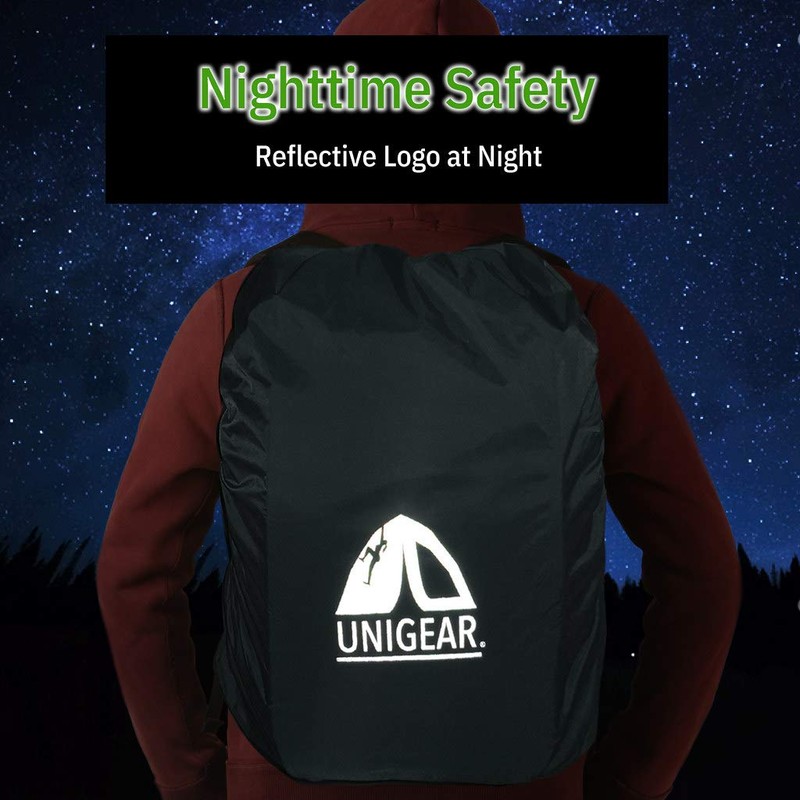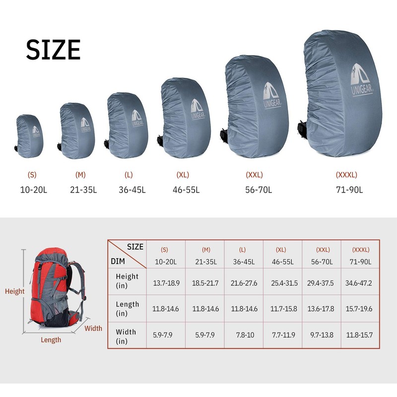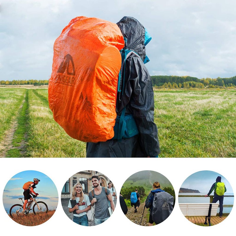 - Adjustable to Cover Your Backpack : Unigear rain cover features 2 vertical anti-slip buckle straps to adjust different backpack and pull the pack cover tight across the pack harness. Reinforce the elastic rim around your backpack to prevent sliding off. Comes in 5 sizes and colors to fit from 10L to 90L backpack