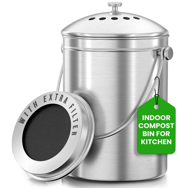 Utopia Kitchen Countertop Compost Bin Kitchen with Charcoal Filter -1.3gallon Stainless Steel Kitchen Compost Bin Countertop - Ideal Kitchen Essentials or Small Composter for Under The Sink Trash