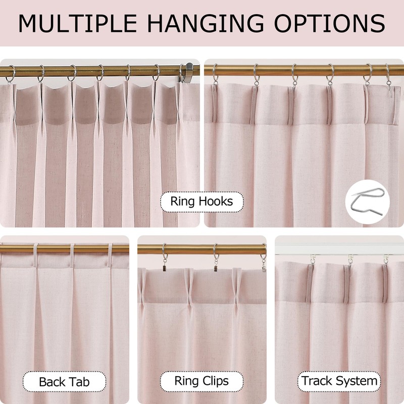 - Pinch Pleats Design:Each page pink curtain panel with 7 pinch pleats generates modern and luxury feel.Linen curtains provide a natural,organic,and textured look that complements a variety of interior styles.By offering linen curtains in various colors,patterns,and lengths,we can cater to customers looking for a casual yet sophisticated window treatment.Hanging these pleated curtains to elevate your windows and increase the aesthetic value to any spaces,bedroom,living room,nursery,office,etc.