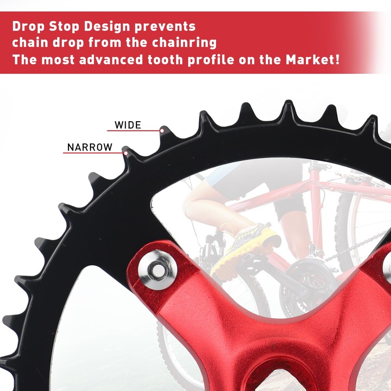 • Drop Stop Design:Narrow wide chainning could prevents chain drop from the chainring, it is the most advanced tooth profile on the Market, making your cycling safer
