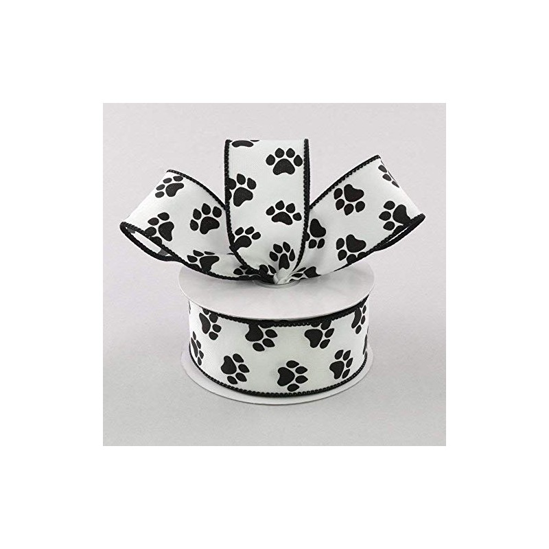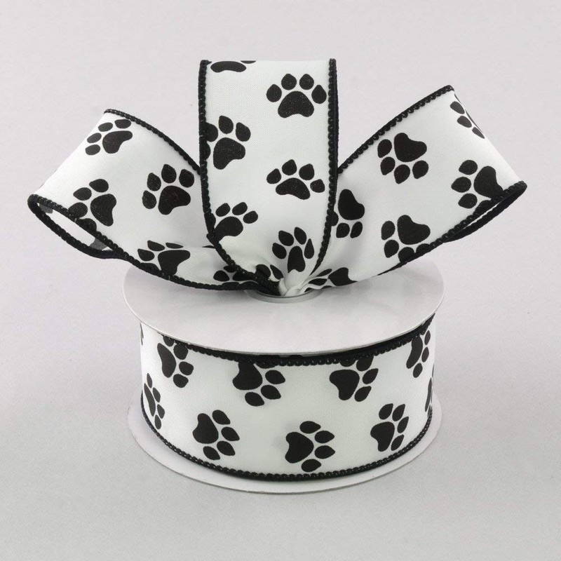 White Satin with Black Paw Prints 1.5" Wired Paw Print Ribbon 10 Yards / 30 Feet of 1.5 Inch Wire Edged Paw Print Ribbon