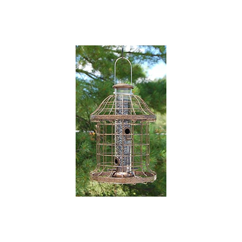 - Caged tube feeder offers seed to birds and not squirrels