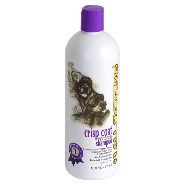 Rich in bodybuilding and all-natural coat and skin purifying botanicals #1 All Systems Botanical Texturizing and De-Toxifying Crisp Coat Shampoo removes unhealthy residues and buildup from products and natural oils.