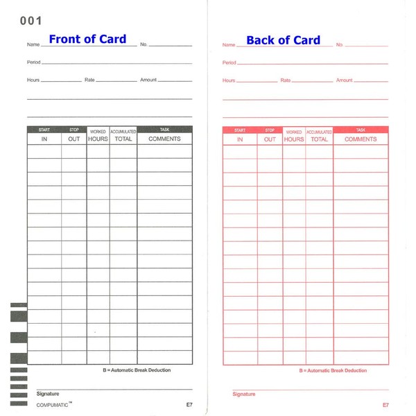 - 10 packs of 100 time cards per pack, Bar coded numbered 1-100 (E7-100)