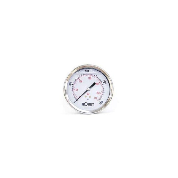 Flowfit 100 mm Glycerine Filled Gauges Rear EntryApplications: For General Purpose, Standard Duty in Non-Corrosive Environments.Dial Size : 100 mm or 4 "Case: 304 Stainless Steel and Roll RingWindow: PolycarbonateSocket and Connection: BrassMovement Parts Semi-brass and complete brassBourdon Tube : BrassPointer and Dial : AluminumClass : KL1.6Media : GlycerineRanges: -30"Hg, 1bar Vacuum to 10,000 PSI, 700 barConnections: 1/2 " bsp rear entryOptions: Throttle Screw, Customised DialsTemp. Range: Ambient Temperature -25' to 60'Minimum temperature should not be less than or equal to the freezing point of the process fluidDual scale psi (outer) in black and bar (inner) in red !!