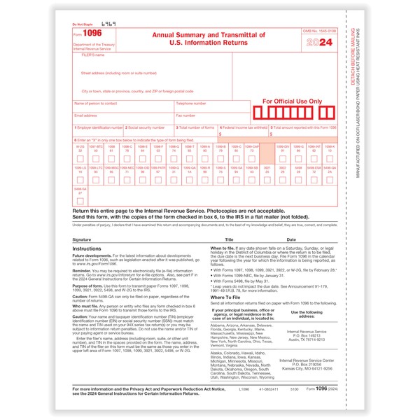 - TAX PRODUCTS: Perfect for tax season, these 1096 transmittal forms are designed to help you transmit paper forms 1098, 1099, 3921, 3922, 5498, and W-2-G to the IRS.