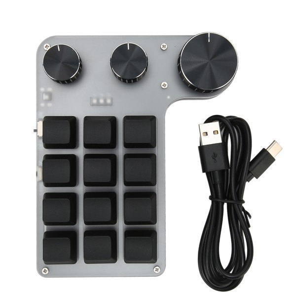 1、One Handed: 12 keys mechanical keyboard is mini with customization features, Type C to USB interface, plug and play with adjustment knobs for quick customization, minus the cumbersome links. 2、Dual Mode Connectivity: Macro keyboard is dual mode that supports both USB and Bluetooth modes and switches automatically. Connecting to USB will switch to USB mode, unplugging USB will switch to Bluetooth mode. Bluetooth wireless 15 minutes no operation, will automatically enter sleep mode. 3、3 Adjustment Knobs: Programmable macro keyboard is 3 knobs design, the knob click function can be used as a mouse left and right button. The knobs can be set to zoom in and out, with functions such as cut songs, volume adjustment, pause, and play. 4、DIY Programming: Macro keyboard's all keys are programmable, allowing you to set all the standard for Windows keyboard key functions and use one key for complex shortcut key combinations. 5、Widely use: One handed programmable mechanical keyboard can make your work faster and more efficient, and make the gaming experience more comfortable for office, gaming, music, media, industrial control, laboratory, production line testing.