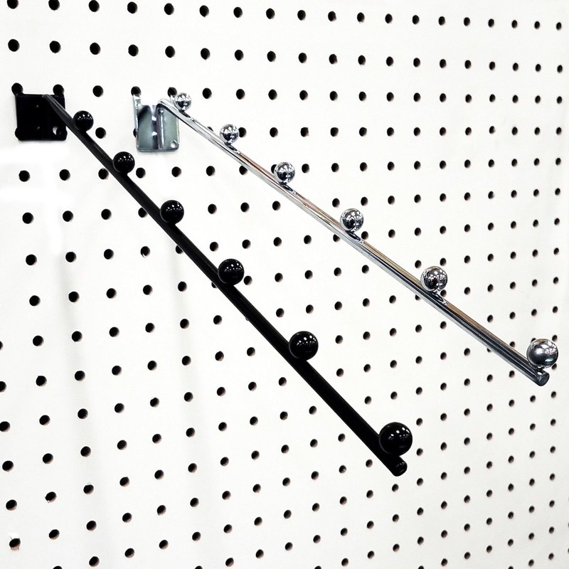 - Our pegboard 6 ball waterfall store fixture has 6 stations to hold items. It measures 14" L and fits 1/4" peg board holes.