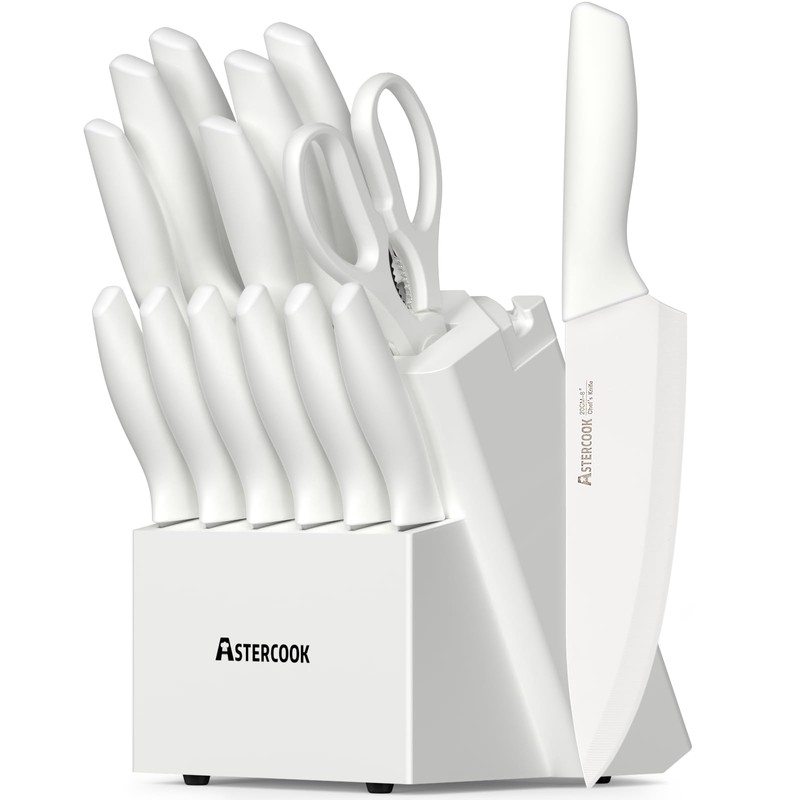 15-Piece Kitchen Knife Set with Block and Sharpener Dishwasher Safe Knife Block Set with Anti-slip Ergonomic Handle White