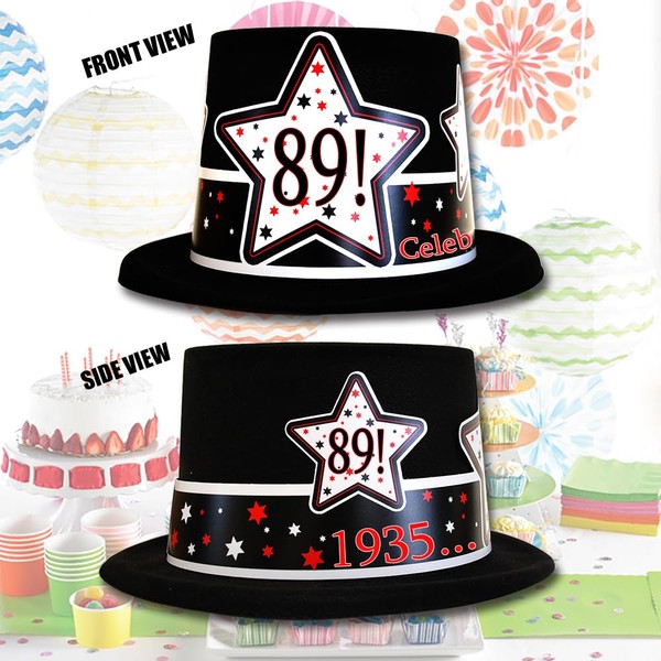 Each - 1935 89th Birthday Top Hat - Designed for those born in 1935 turning 89 in the year 2024. 1935…was a very good year! Great for birthdays, reunions or special events. Fun for everyone at the party! One size fits most adult and teen heads. Plastic backed velour topper will make great photo ops. Bright and bold graphics proudly displays the specific age (repeats 3 times on the hat rim).