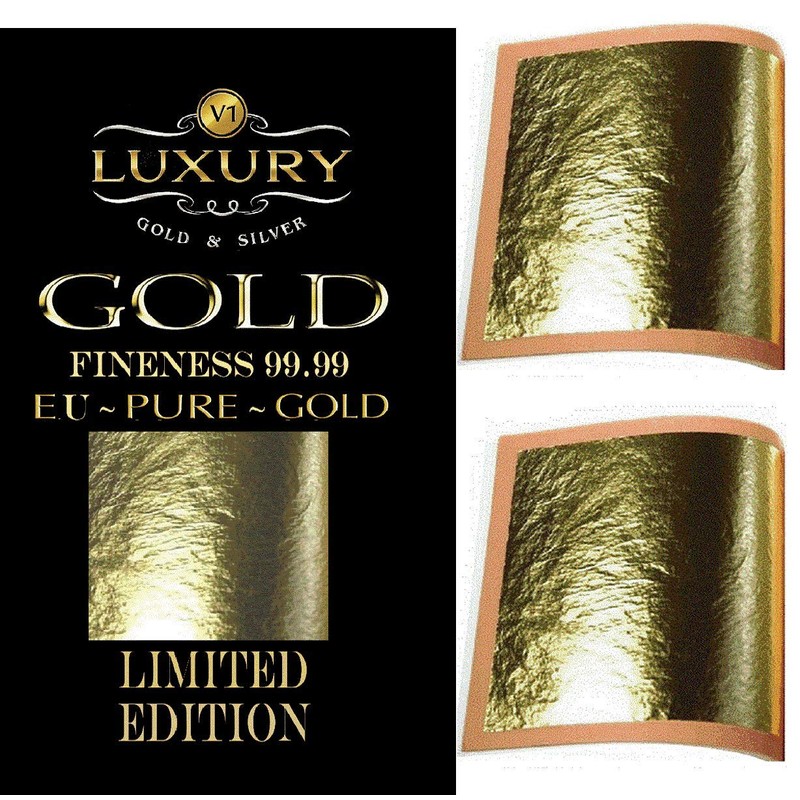 24ct gold. These leaves are not as damageable as pure natural gold and therefore easier to handle - also for beginners. The gold layer is much thinner compared to grinded gold leaves. Gold on Base is not the same as composition gold! Product information: 5 24ct gold leaves on base (no composition gold) each 4.5cm Thickness of Gold in each leaf approx. 0.2 - 0.4 microns on base Gold on Base is not the same as composition gold! Usage: Decorating items for furniture, antique, photo frame, art & craft, sculpture, and multi-purposes. Suitable for general Gilding. Decorating lettering and bookbinding's, popular in interior design and artistic work You can use the gold leafs on wood, sand, cement, glass, metal, carved and raised letters, signboards, trucks and general flat surfaces. Do not heat Gold on base is not edible Packaging: Each gold leaf of the set is separated by a dusted paper to prevent them from sticking together - this paper does not damage the gold. Condition: Brand new