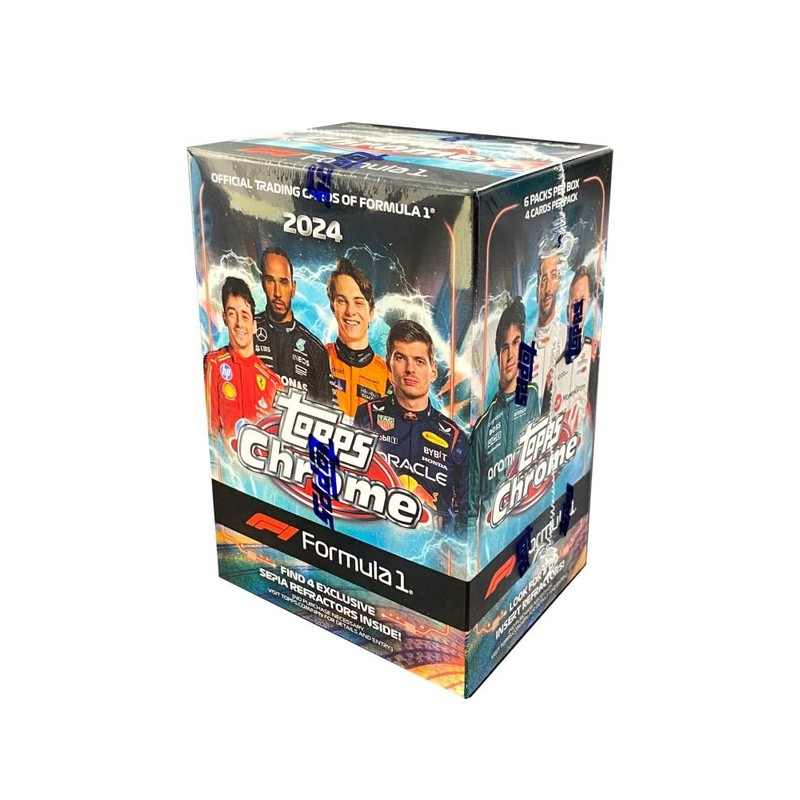 • This is a brand new 2024 Topps CHROME Formula 1 Racing Series Unopened Blaster Box that contains 24 cards per box (6 packs, 4 cards per) including 4 EXCLUSIVE Sepia Refractor Parallels and 3 Insert Cards!