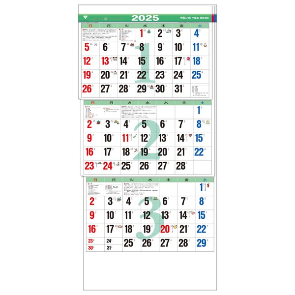 トーダン 2025年 カレンダー 壁掛け カラー3ヶ月文字S(上から順 / ミシン目) 52.3 x 24.2cm TD-981