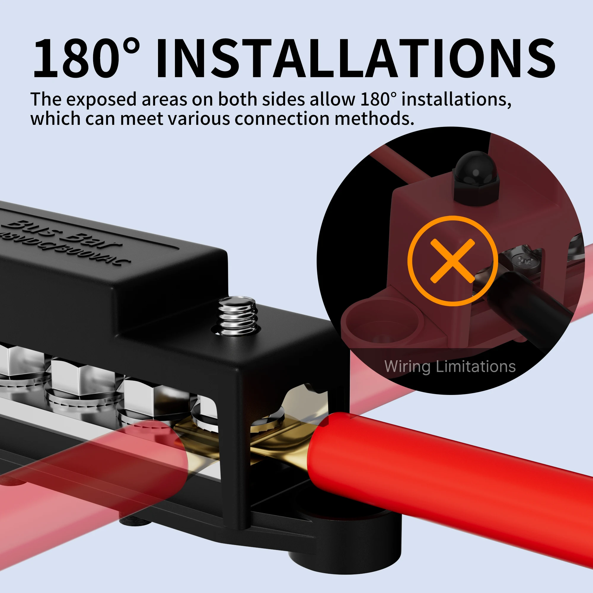 * 【Protect Cover】The heavy duty busbar cover can cover exposed areas to prevent accidental short circuits. The exposed areas on both sides allow 180° installations, which can meet various connection methods.
