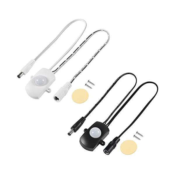 2PCS Mini Pir Motion Sensor Switch, DC 5-24V Auto PIR Infrared Motion Sensor Detector LED Light Strip Switch 5.5 DC Plug for DIY LED Lighting, Light Sensor, Time & Distance Adjustable (Black & White)
